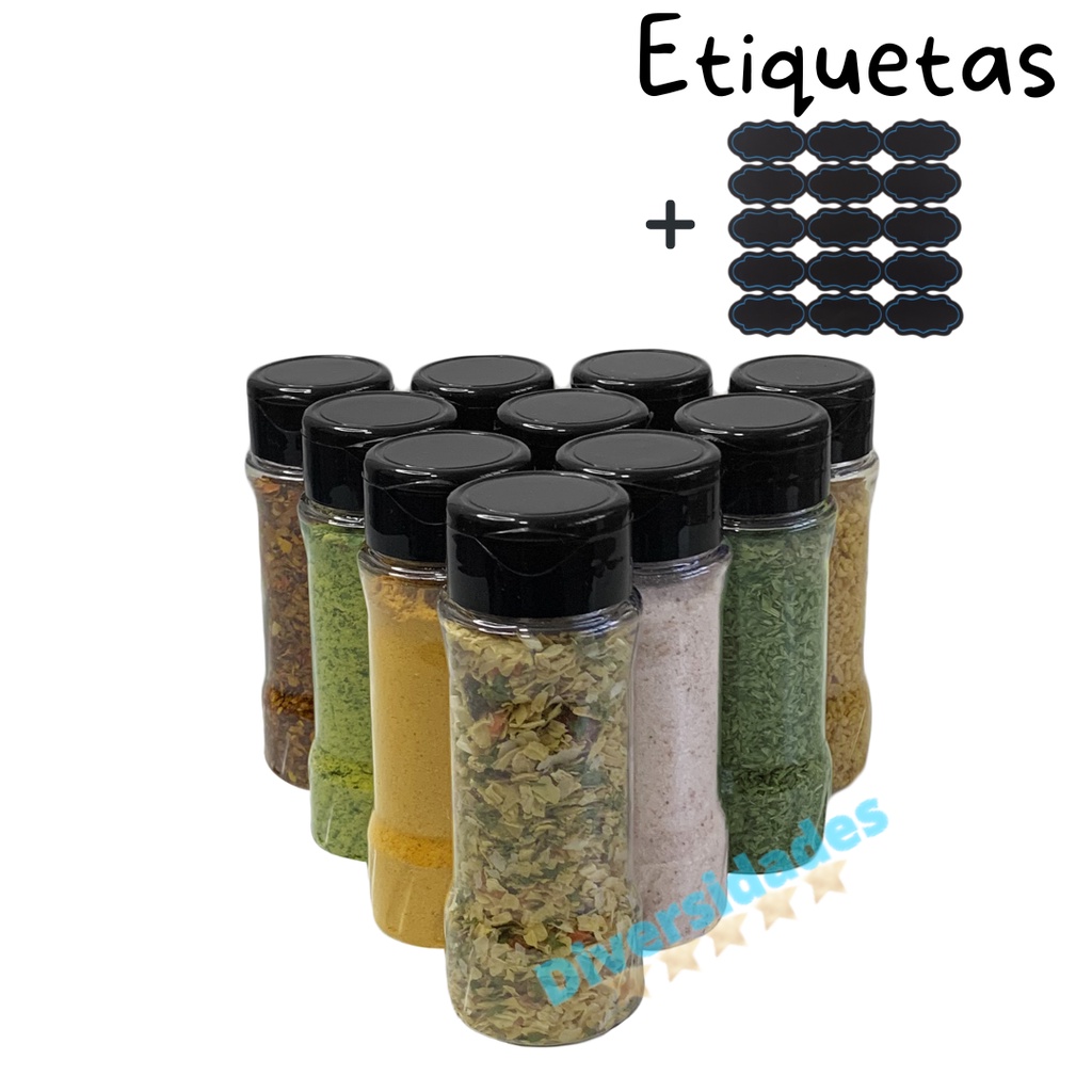 Kit 10 Potes de Plástico Tempero Condimento com Tampa Dosadora Única Com Etiquetas