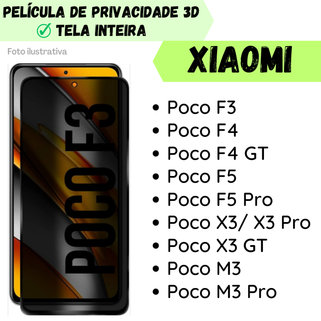 Película de Vidro 3D de Privacidade Para Xiaomi Poco F3/ Poco F4/ Poco F4 GT/ Poco F5/ Poco F5 Pro/ Poco X3|X3 Pro/ Poco X3 GT/ Poco M3/ Poco M3 Pro/ Película Protetor de Tela.