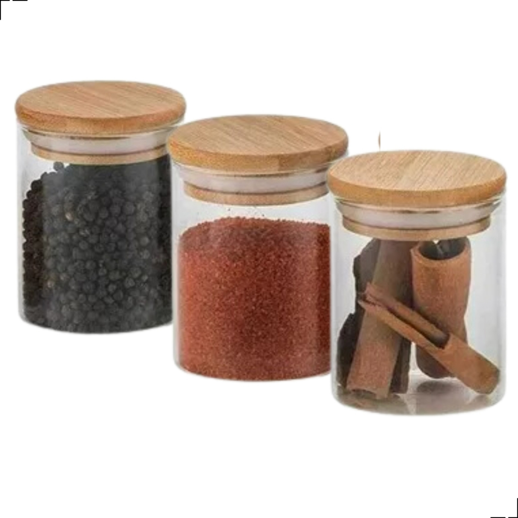 Kit com 3 Potes de Vidro Herméticos com Tampa de Bambu para Mantimentos e Temperos 250 ml