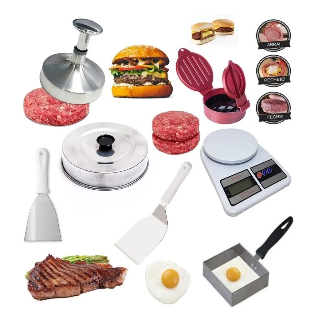 Kit Hamburguer Hamburgueria - Espátulas Abafador Modelador Hambúrguer Ovos Balança Digital