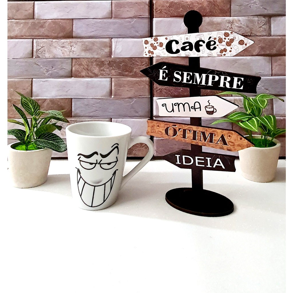 Enfeite de Mesa - Seta " Café é Sempre uma Ótima Idéia " em MDF Adesivado com Base