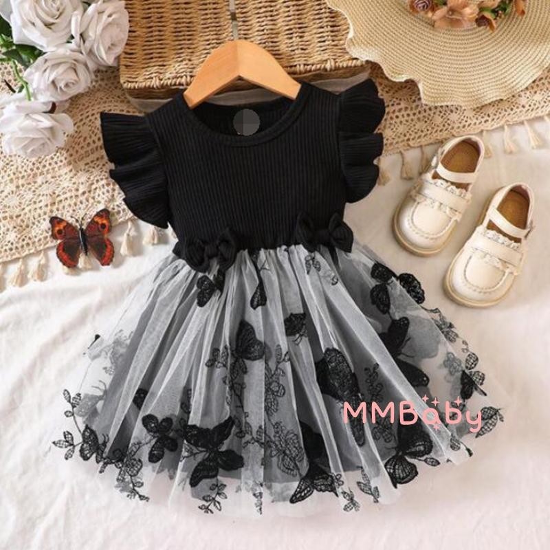 Vestido De Verão Mbaby-Baby Girl Elegante Manga De Mosca De Pescoço Redondo 3D Bordado Borboleta Tulle Infantil Toddler