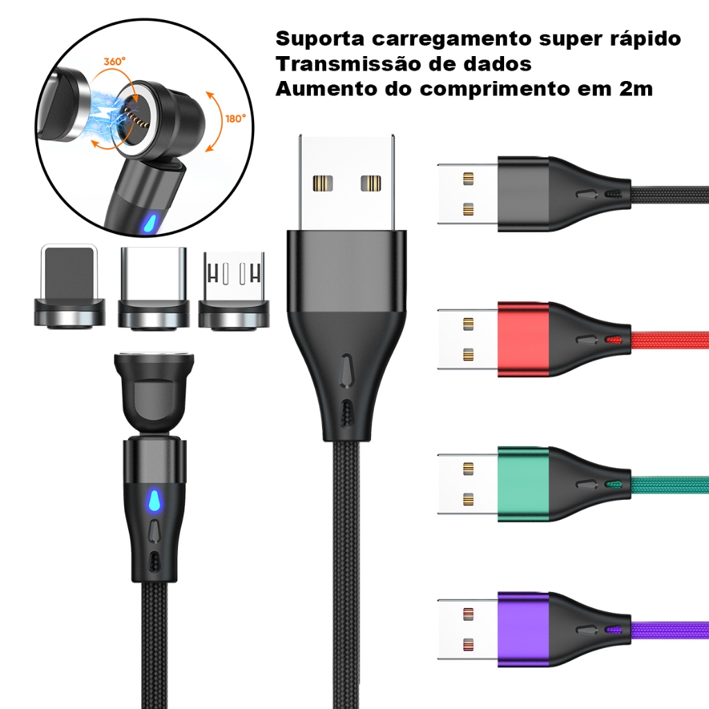 Cabo Carregador Magnético 3 Em 1 Carregamento super rápido de 3A com transferência de dados, função de rotação de 540° para ios Android Tipo-c