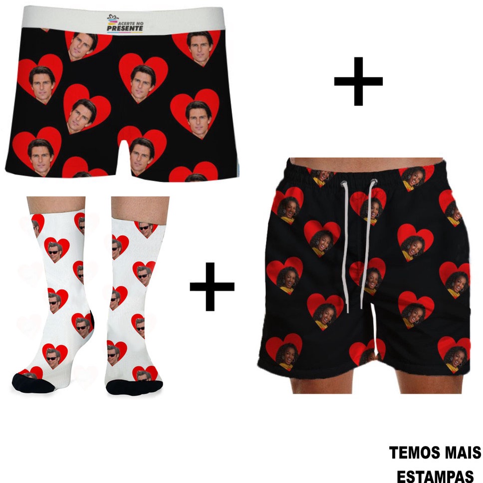 Kit Short Masculino + Meia + Cueca Personalizados com foto casal mozão love namorados zueira presente