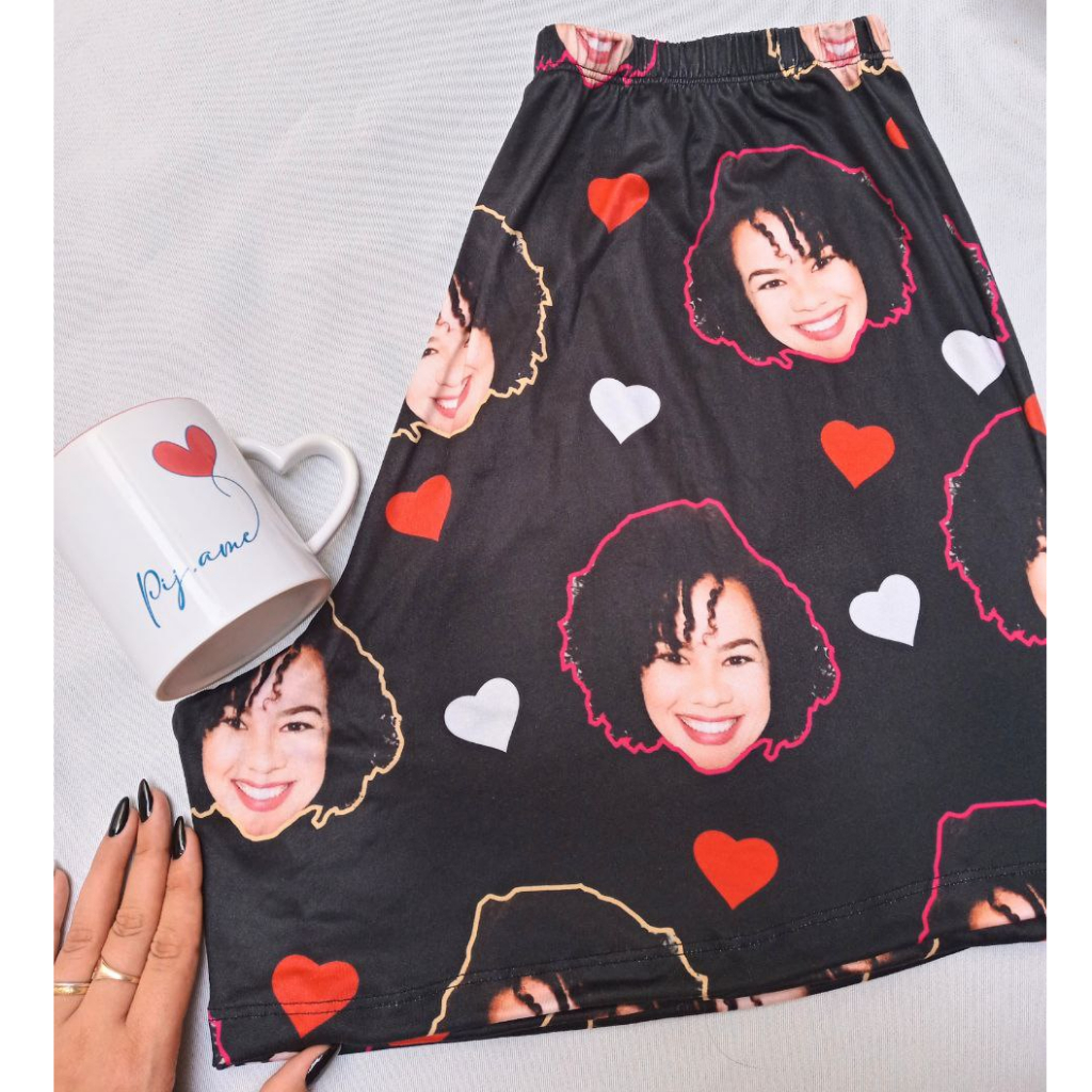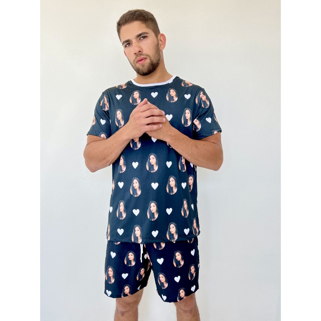 Pijama Masculino Personalizado com foto Fundo Preto Coração Branco Camisa e Short