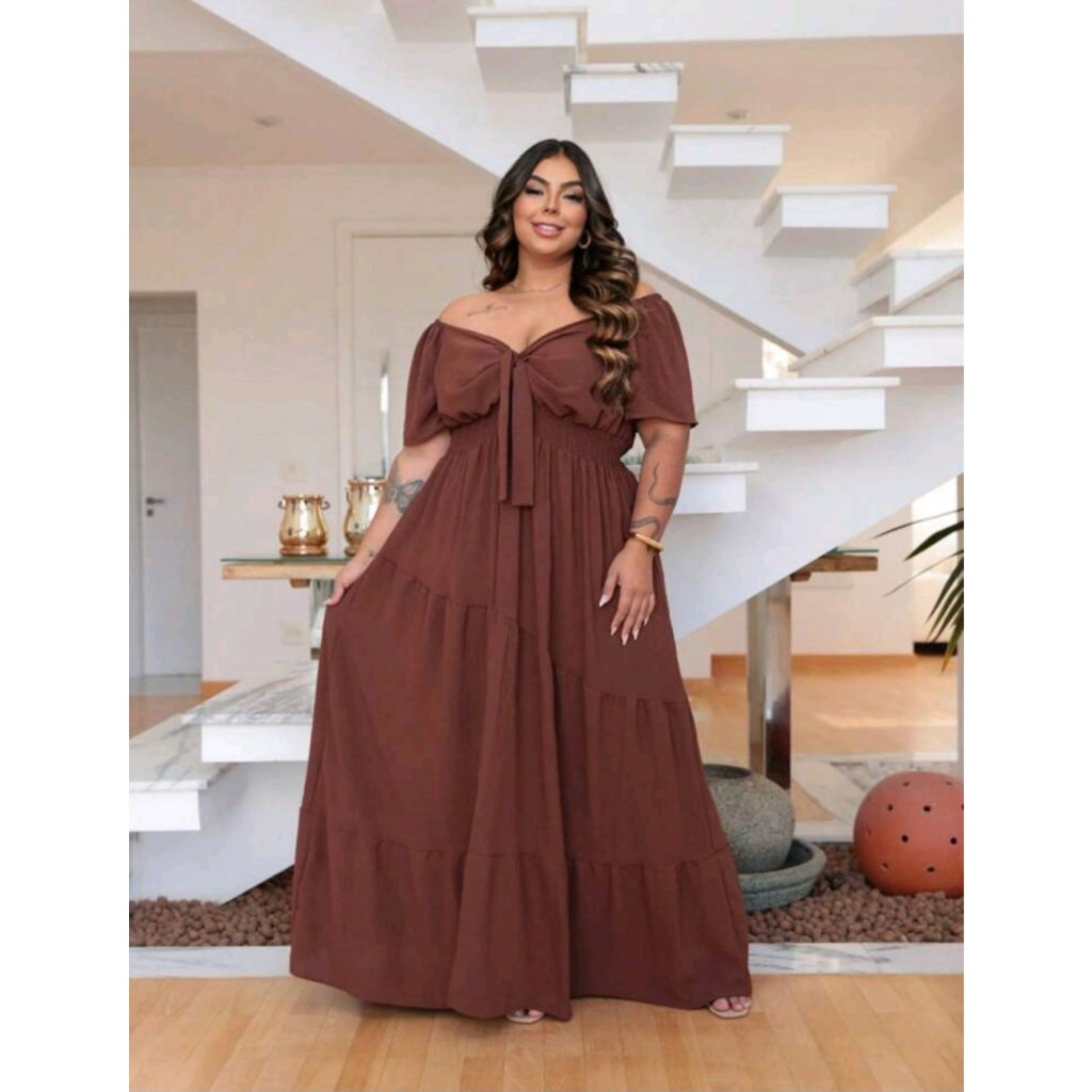 Vestido Feminino Longo Maria Canelado Social Moda Evangelica Plus Size Curve +