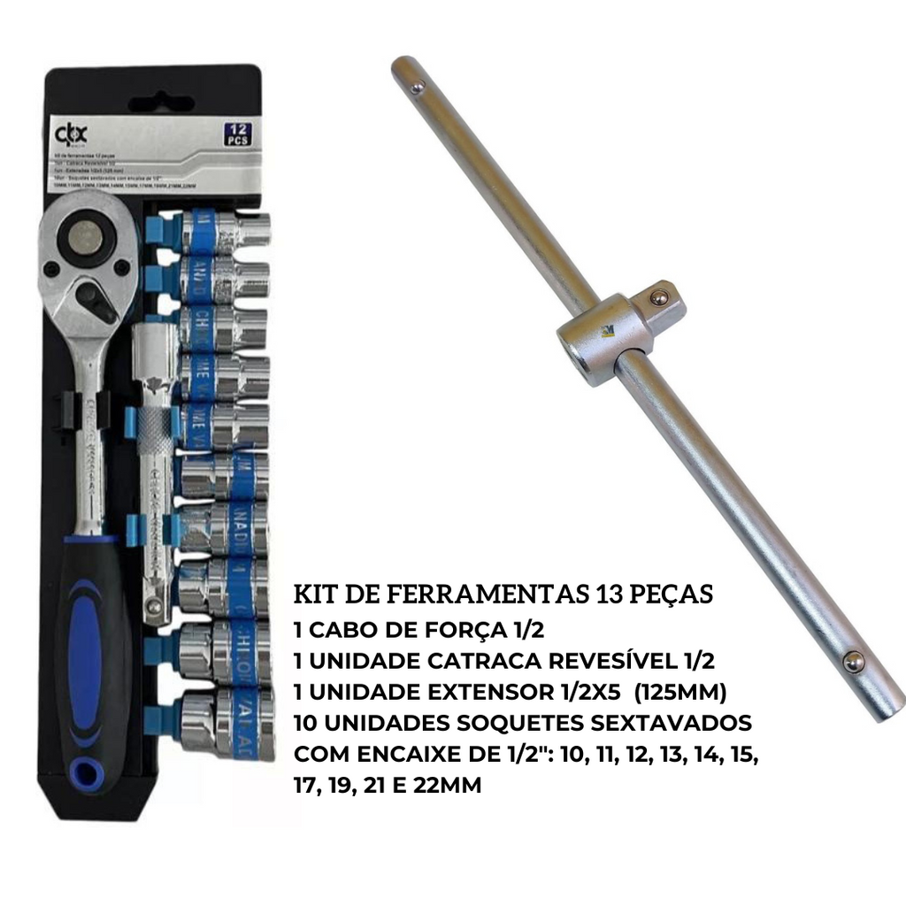 Jogo De Soquete Sextavado 1/2 Com Catraca e Cabo de Força 12 Peças Com Extensão 10-22 mm
