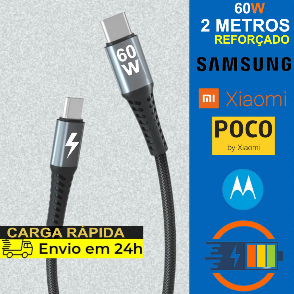 Cabo Tipo C Turbo 60W 2 Metros para Samsung Xiaomi e Iphone 15 Turbo Reforçado USB-c nas duas pontas