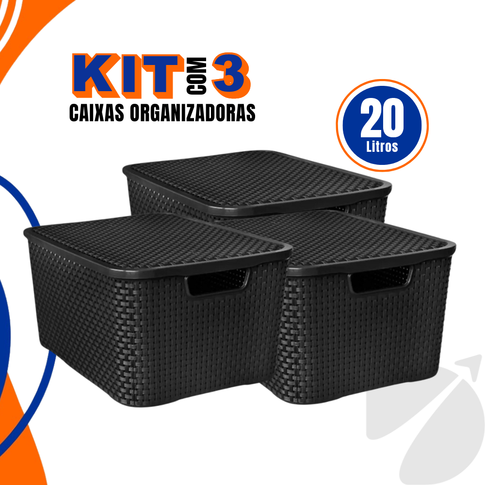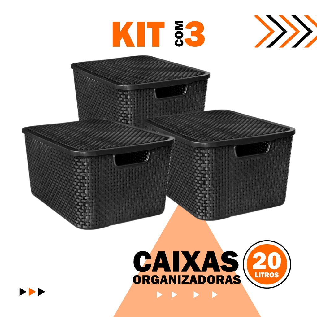 Kit 3 Caixas Organizadoras 20 Litros, 15 Litros e 7 Litros Cesto Multiuso Rattan Com Tampa Preto Empilhavel Brinquedos Roupas Livros Caixa Organizadora