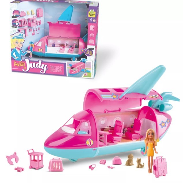 Brinquedo de Avião da Judy com Boneca Aeromoça Pets e acessórios