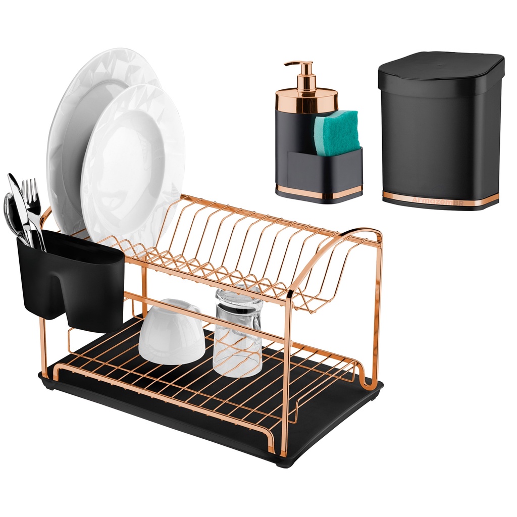Kit Escorredor De Louças Lixeira 2,5L Dispenser Porta Detergente Cozinha Preto Cobre Rose Gold - Future