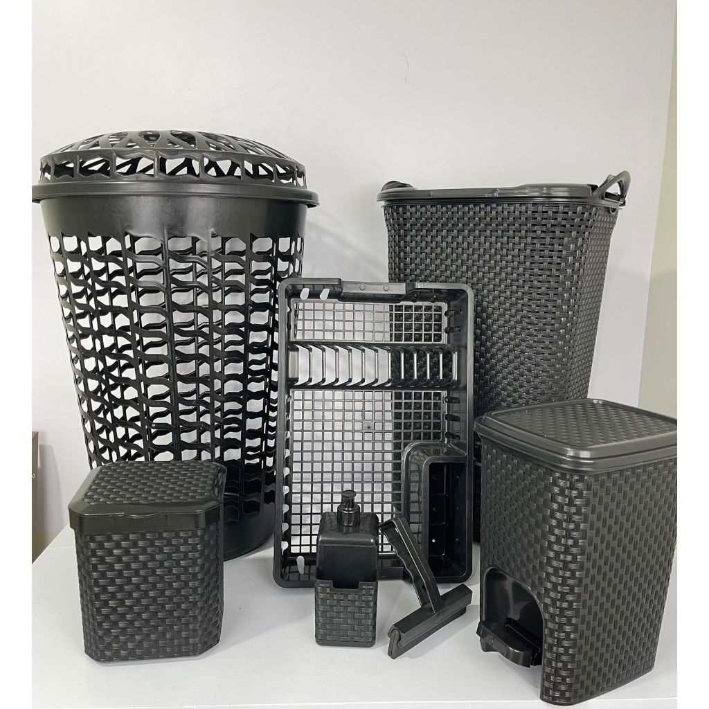 Kit Rattan Master Completo Cesto 50L, Lixeira 7L, Lixeira 5L, Escorredor, Dispenser Pia e Rodo Pia
