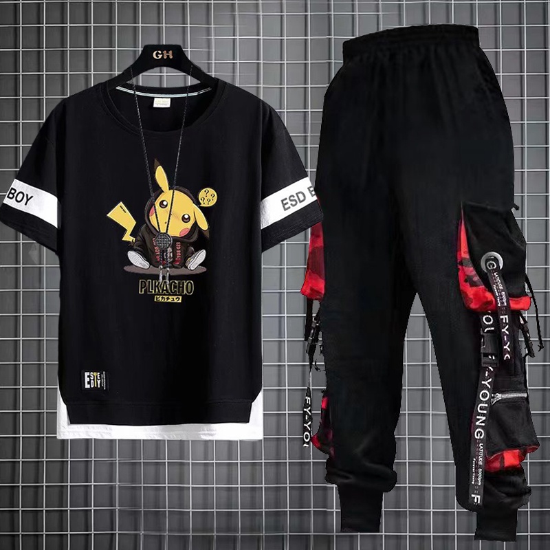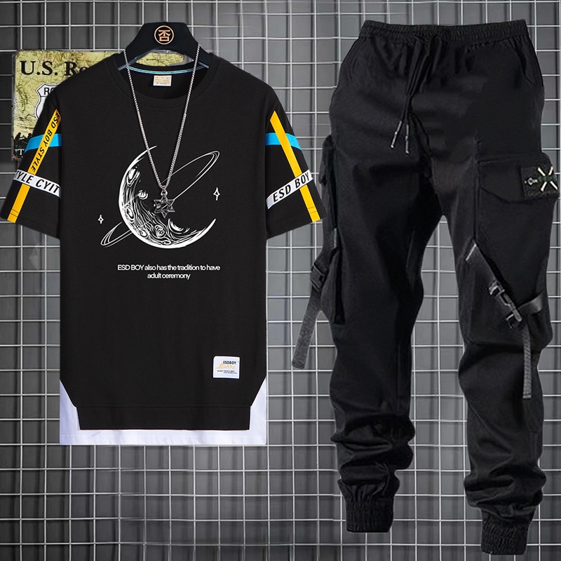 Calça De Carga Masculina Estilo Hip Hop Joggers + Conjunto De Moda Com Camisetas Casuais De Manga Curta