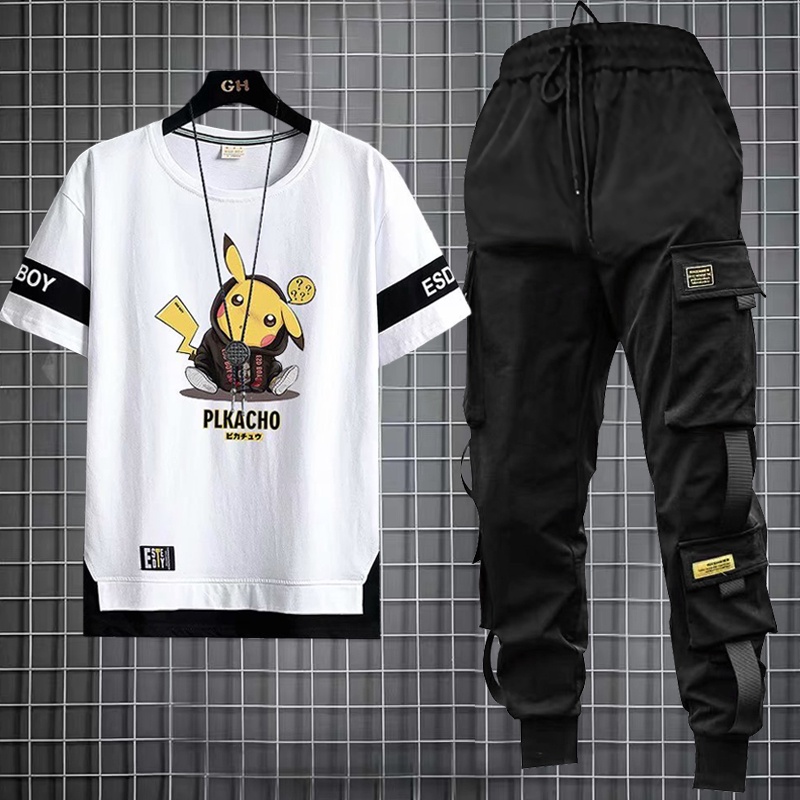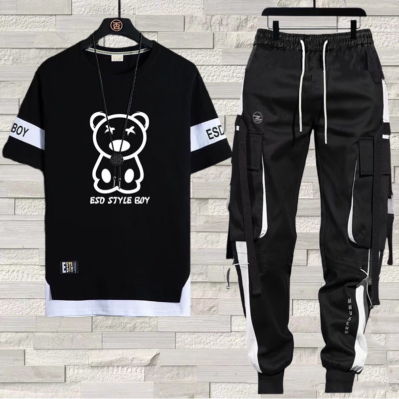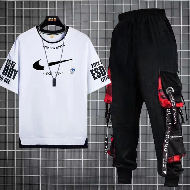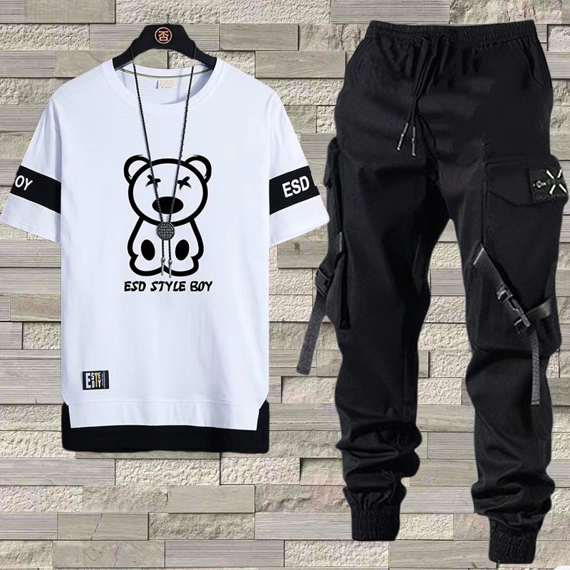Calça De Carga Masculina Estilo Hip Hop Joggers + Conjunto De Moda Com Camiseta Casual De Manga Curta