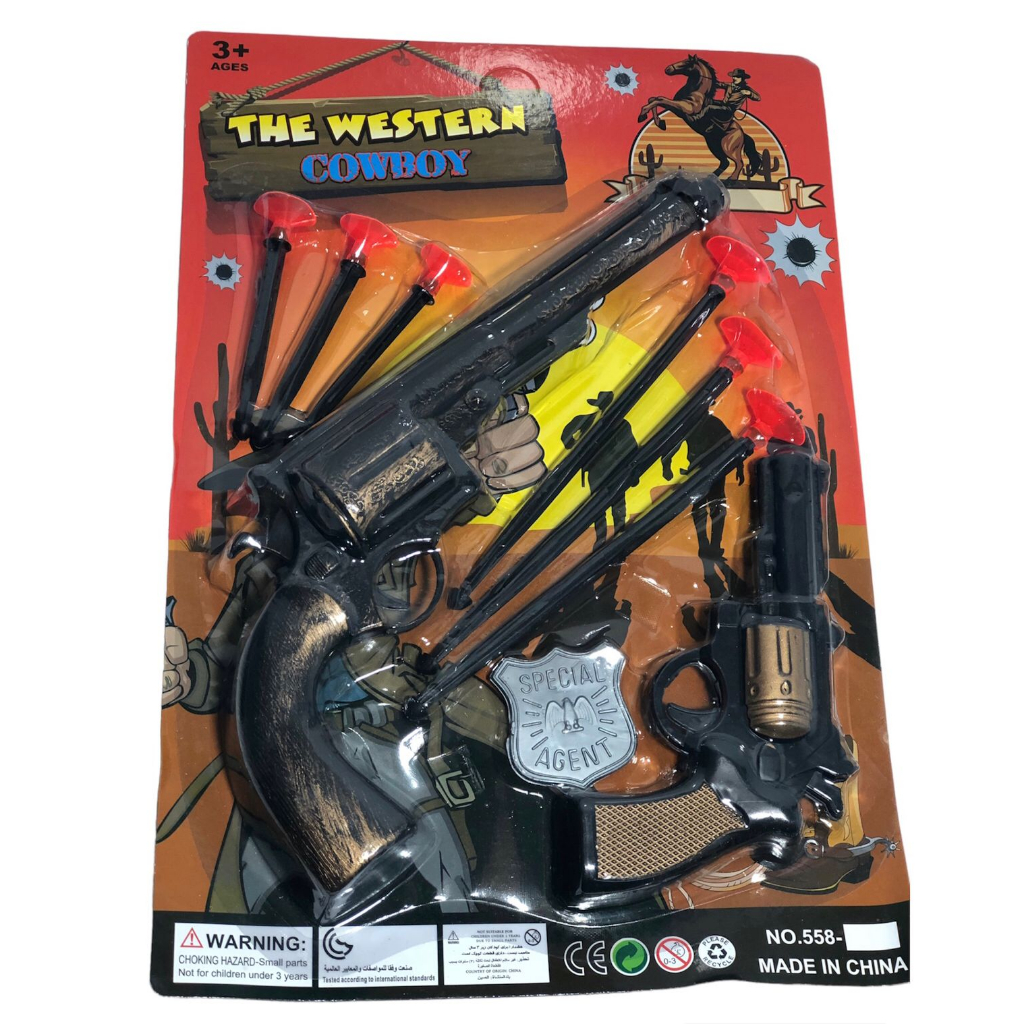 Lançamento 2 Pistolas Lança Dardos Arminhas Sheriff Faroeste Cowboy Top + 6 Lançadores + Distintivo