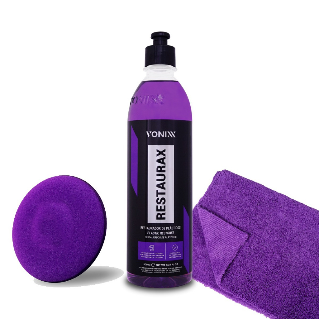 Kit Restaurax 500ml Revitalizador de Plasticos Borracha 2 Toalha Microfibra 2 Aplicador de Espuma Vonixx