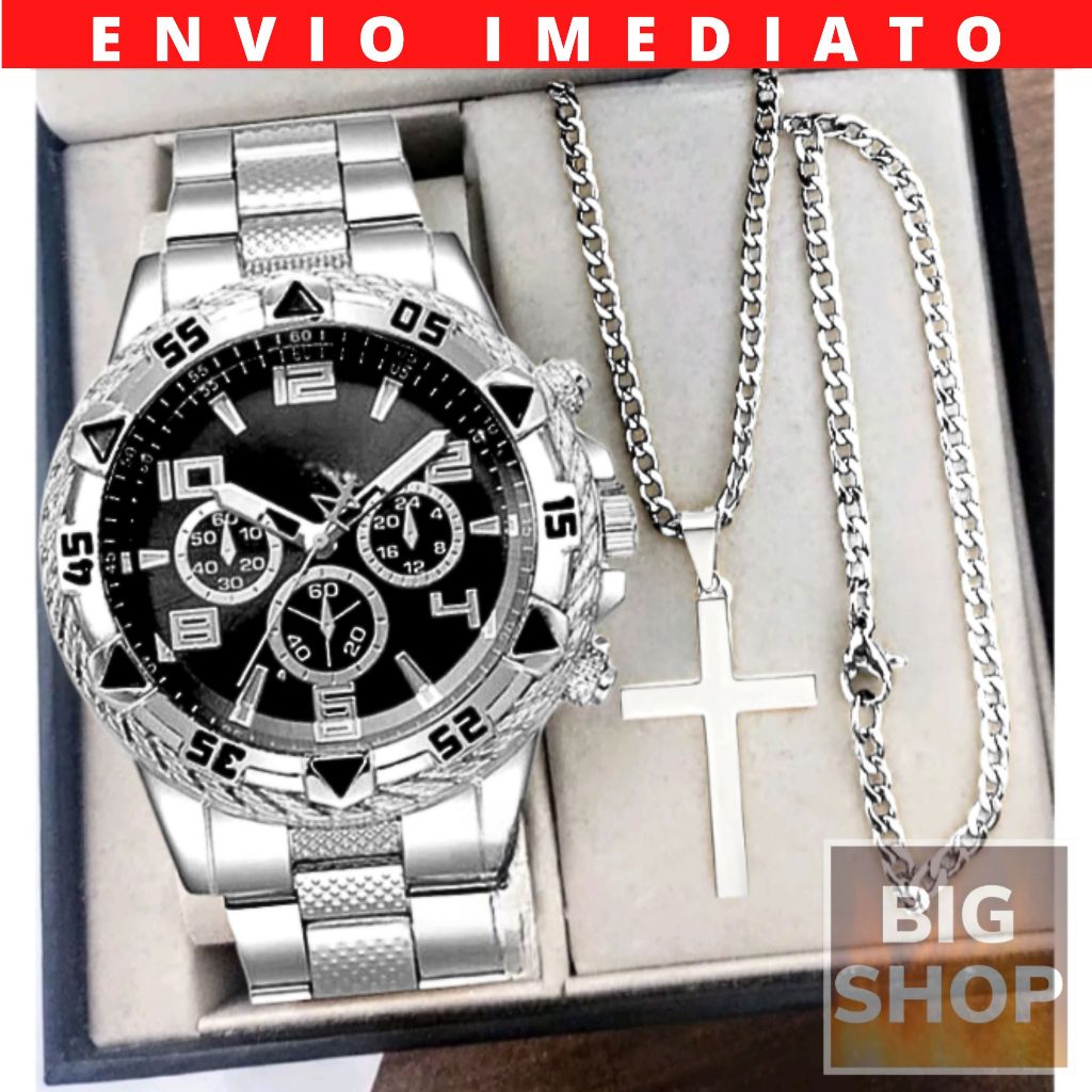 Relógio Masculino Prata Inox Kit Colar Cruz Fina + Pulseira Fina e Pingente