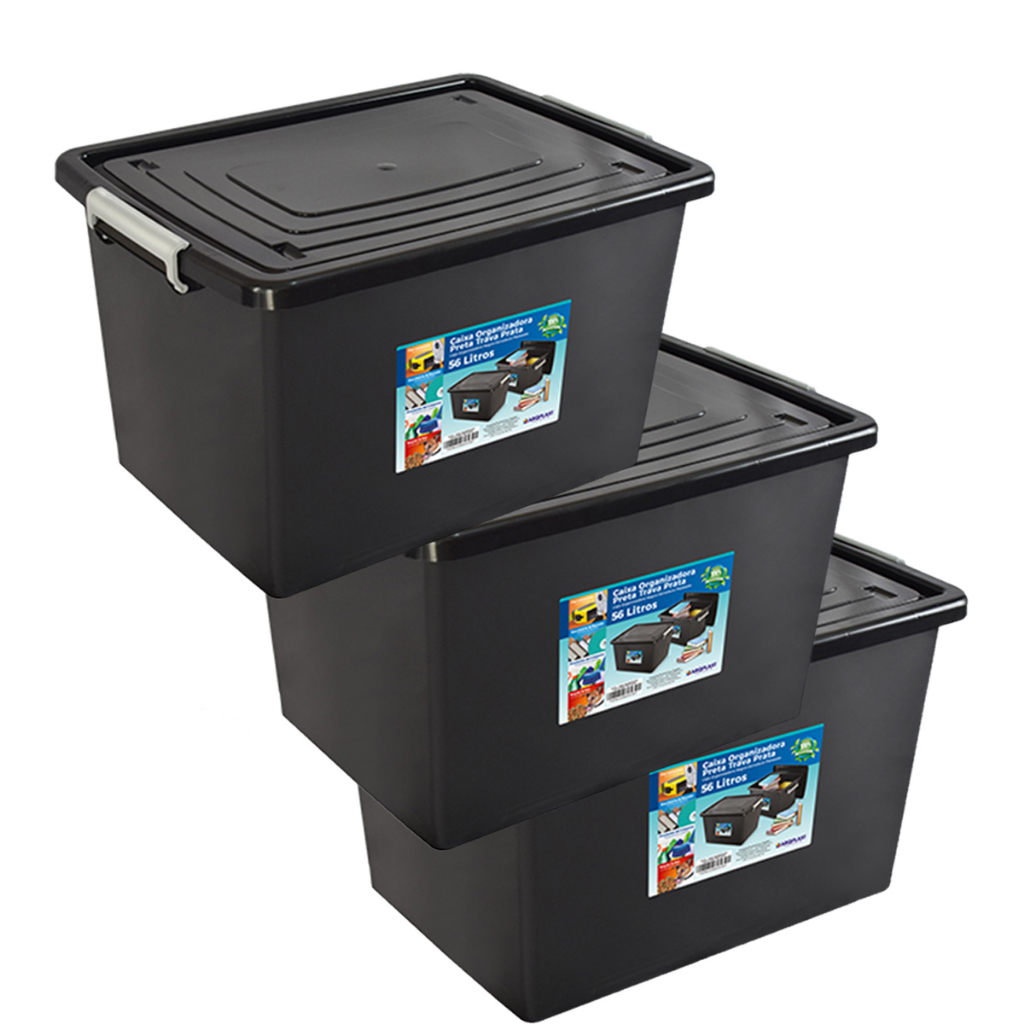 Kit 3 Caixa Plastica Organizadora Multiuso 56 Litros Preta Com Tampa E Trava Arqplast