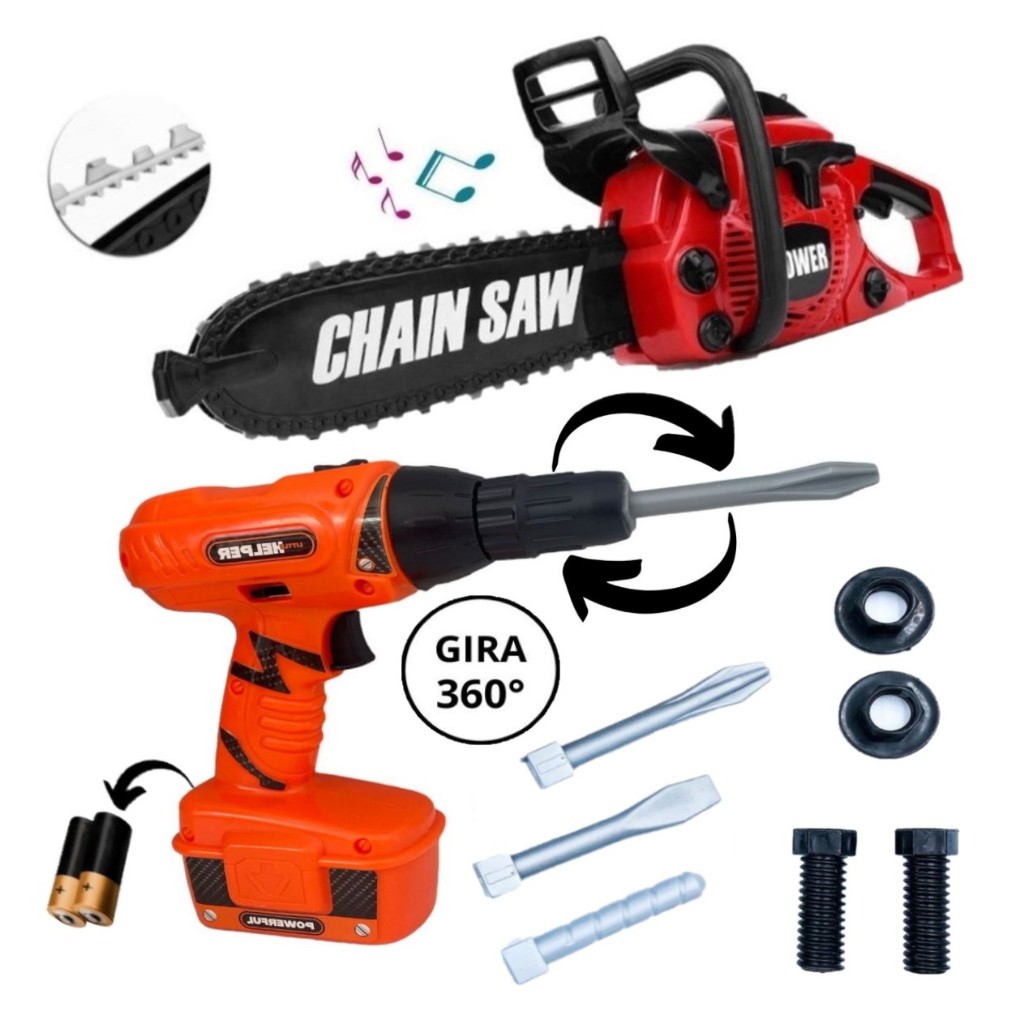 Kit Ferramenta Infantil Com Motosserra E Parafusadeira Furadeira Elétrica De Brinquedo