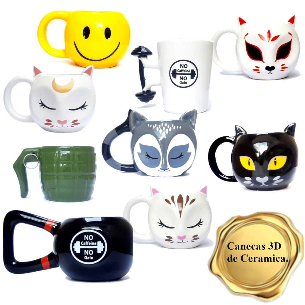 Caneca Cerâmica 3D Esmaltada Brilhante Artesanal Divertida- Escolha a sua Tematica - gato gatinho listrado lua japones preto olho granada guerra militar halteres peso academia crossfit kettlebell guaxinim fofa colorida pintada