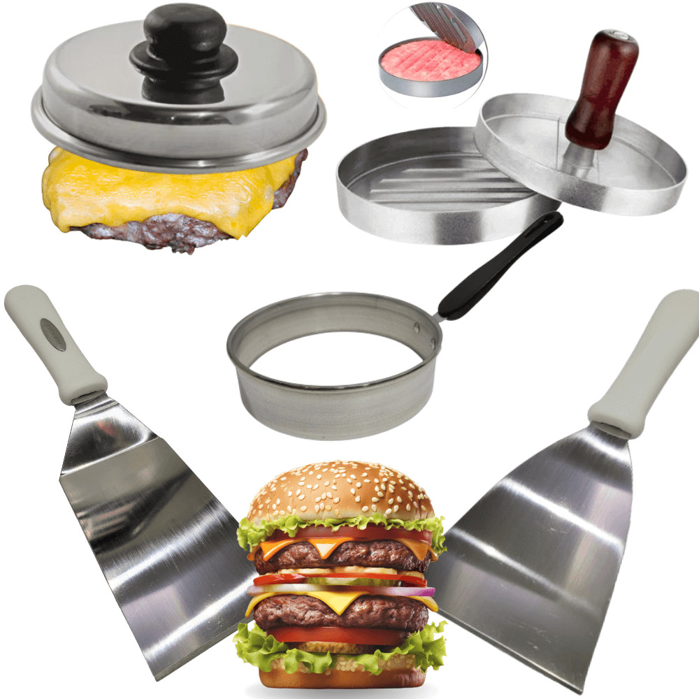Kit Hamburgueria Completo Modelador de Hambúrguer Molde Ovo Espátulas Curva Reta Inox Tampa Abafador