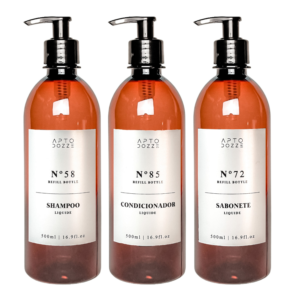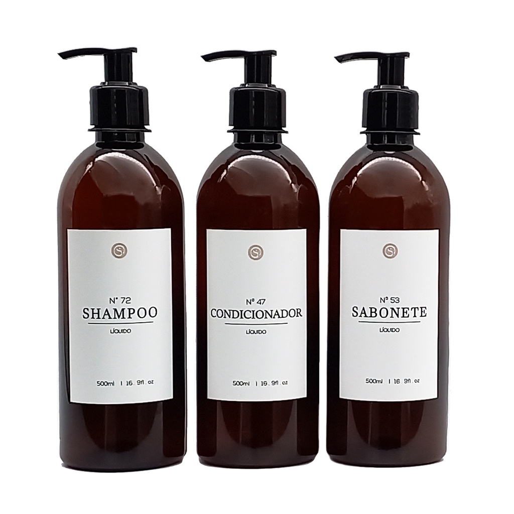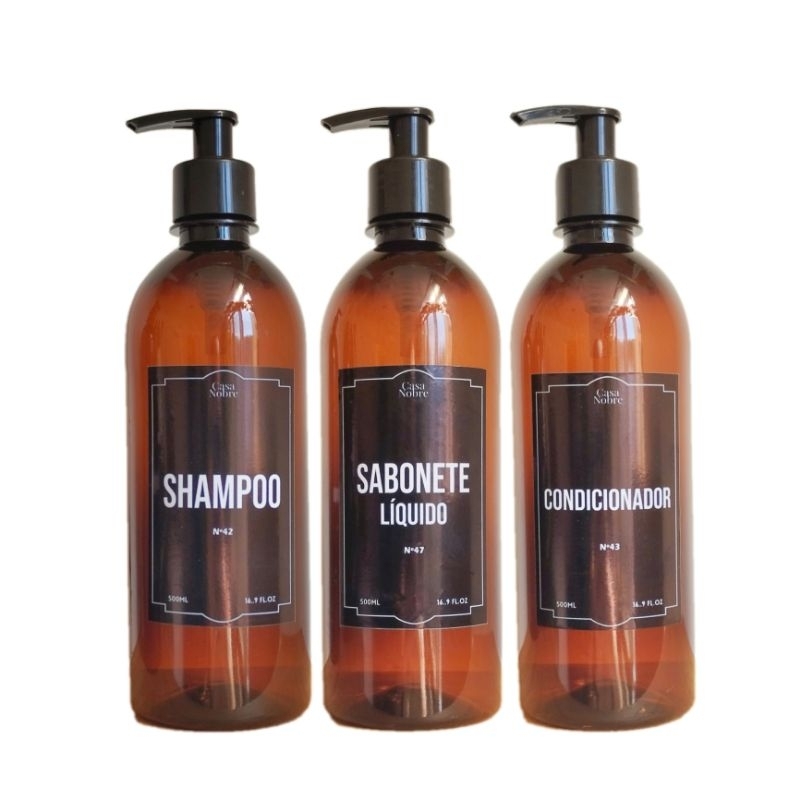 kit Banho Frasco Âmbar Pet 3pçs Shampoo Condicionador e Sabonete líquido Dispenser 500ml