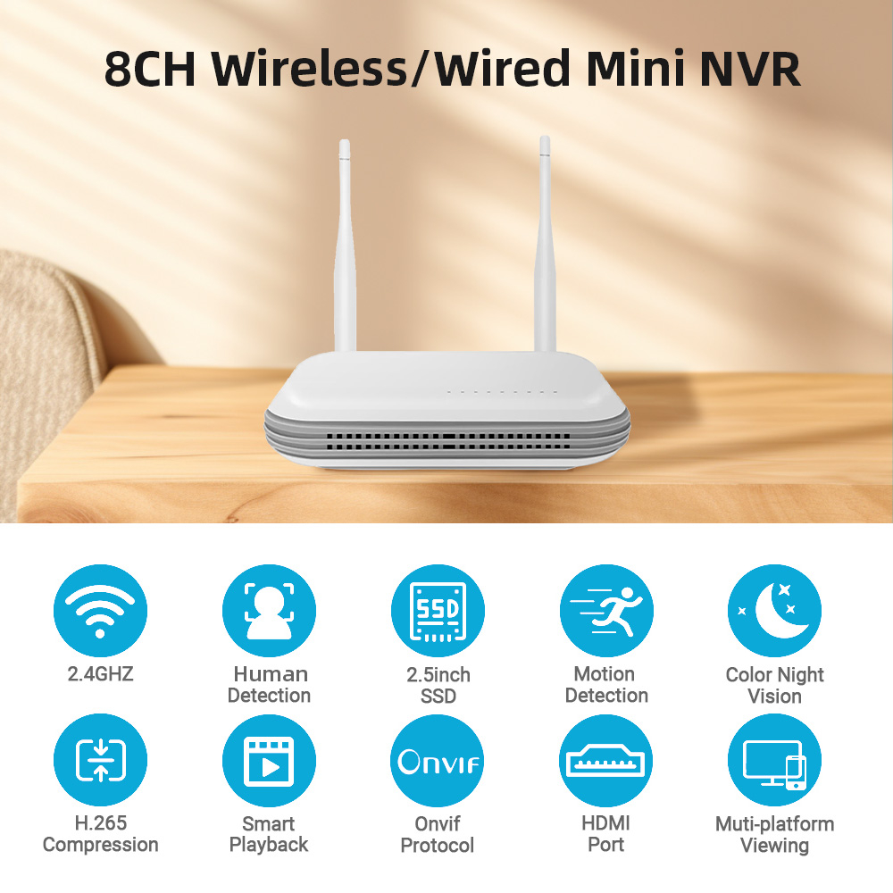 WIFI NVR Mini 8CH 5MP/8CH 3MP Gravador De Vídeo Icsee Para Sistema De Segurança Sem Fio Detecção De Face Com Slot TF P2P H . 265