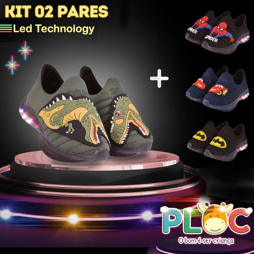 KIT 2 PARES DE TÊNIS LED INFANTIL MENINO LED39 - VERDE DINOSAURO REX + PAR ADICIONAL A SUA ESCOLHA