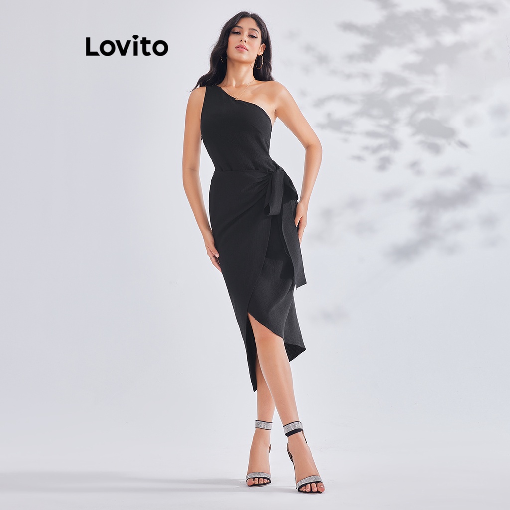 Lovito Vestido Casual Liso Envoltório Assimétrico Com Renda Para Mulheres LBE03140 (Preto)