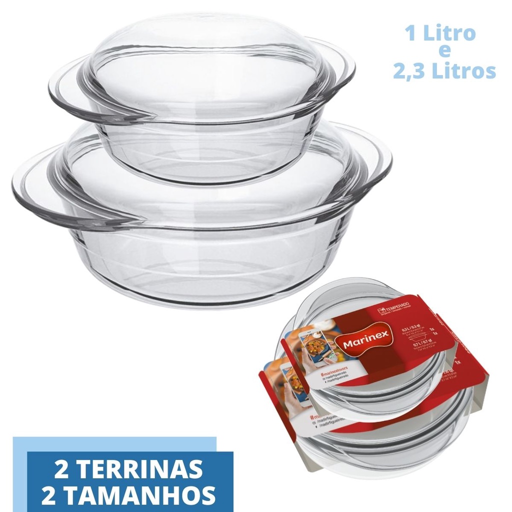 Travessa Vidro Terrina 2 Tamanhos 1L 2,3L Base+Tampa Marinex