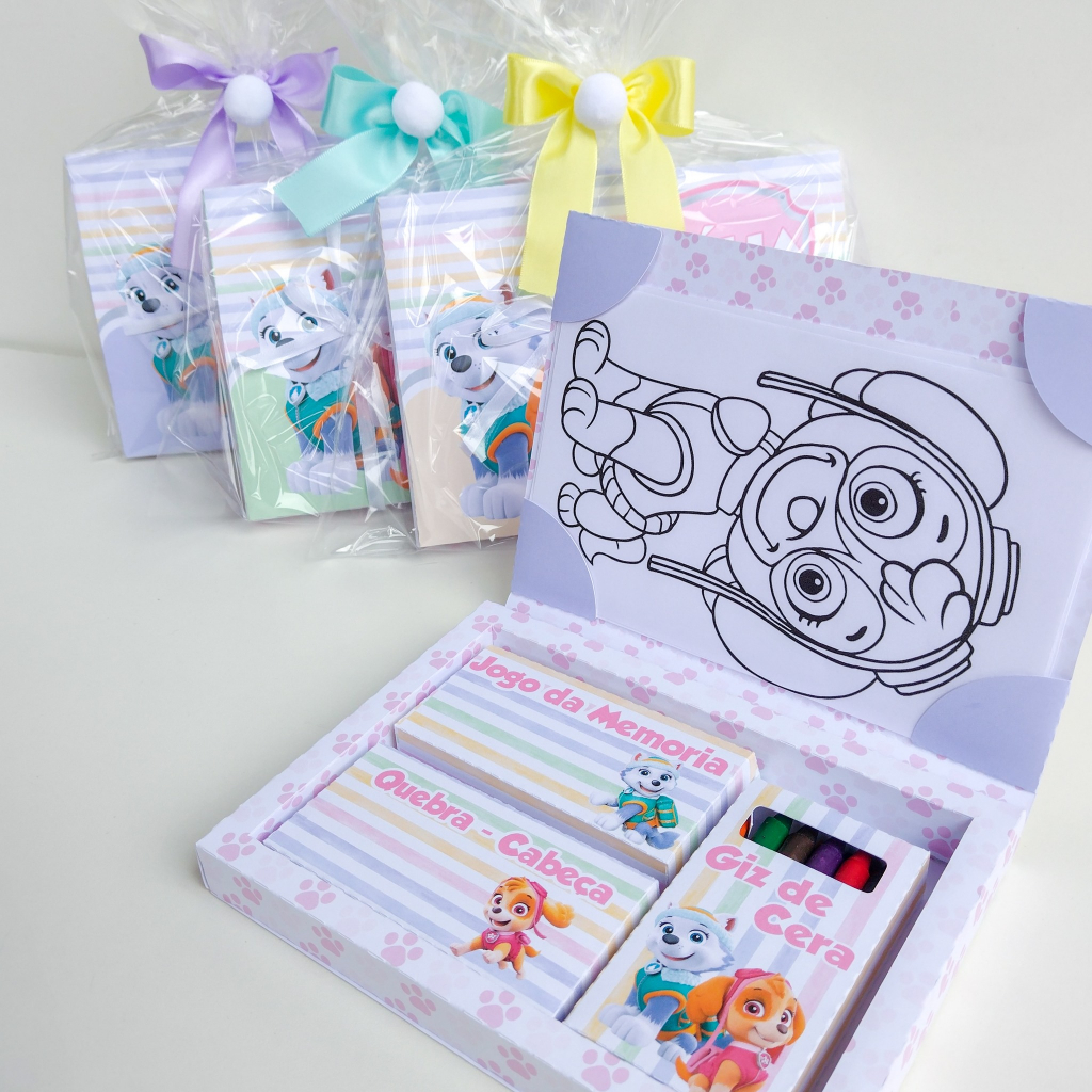 Caixa com jogo da memória, quebra cabeça, livro de colorir e giz de cera ou lápis de cor, lembrança de festa.