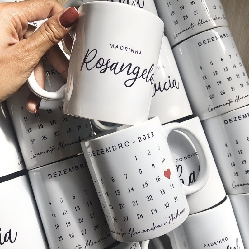 Caneca Personalizada Calendário de Porcelana para Casamento - Madrinha, Padrinho, Pais etc