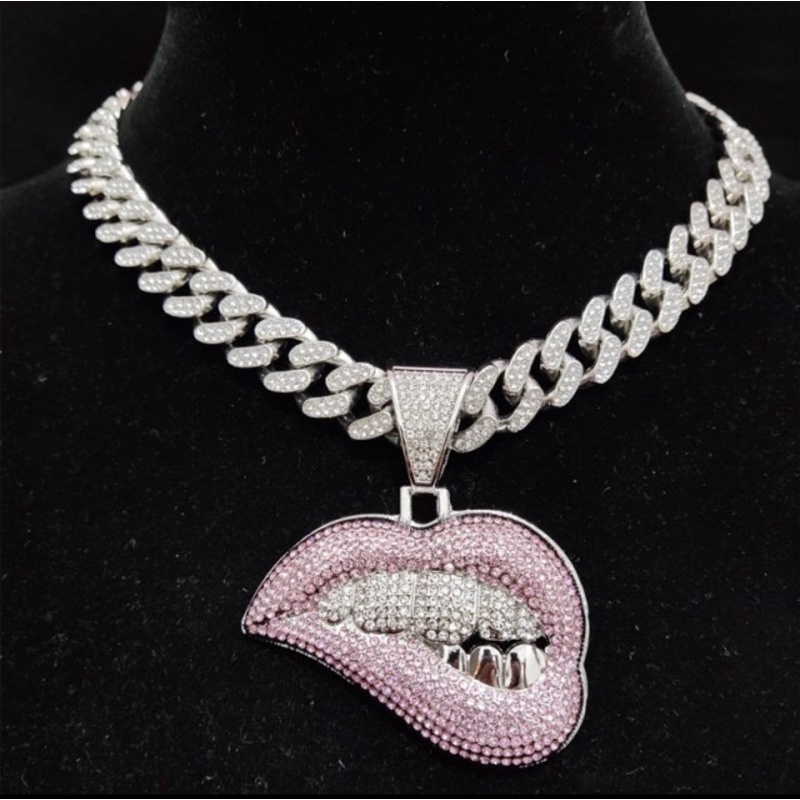 Corrente cravejado com pingente Lábio ice Hip Hop Rap prata e ouro Banhado