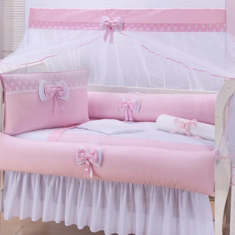 Kit Protetor Berço 09 Peças Gorgurinho Laço Rosa Completo Modelo Padrão Nacional e Americano - Super Promoção