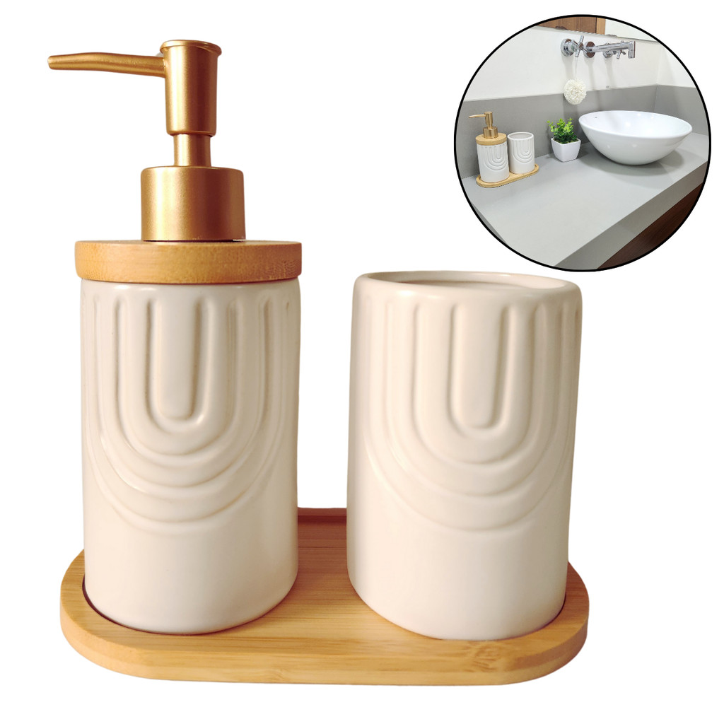 Kit Conjunto Banheiro Lavabo 3 Peças Com Bandeja Oval de Bambu Dispenser Sabonete Liquido Porta Escova Cerâmica