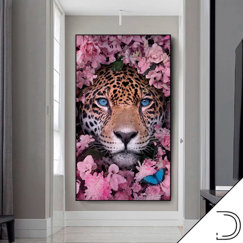 Quadro Decorativo Grande Alta Resolução Quadro de Parede Paisagem Pintura Fotografia Abstrata Leopardo Com Flores Rosa 1 Peça 70x90
