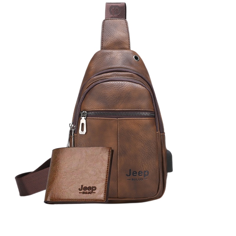 Saco De Peito Masculino JEEP De 2 Peças , Bolsa Esportiva De Couro De Alta Qualidade + Carteira Curta Com Dupla Dobra , Um Bom Ajudante Para Homens De Sucesso !