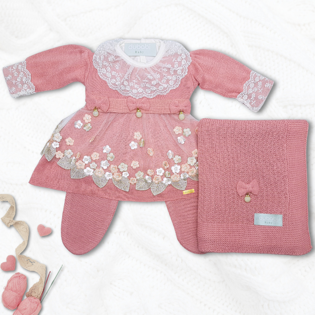 Saida de Maternidade Menina Vestido Recem Nascido Princesa Trico 4 Peças Tam P 0 a 3 Meses