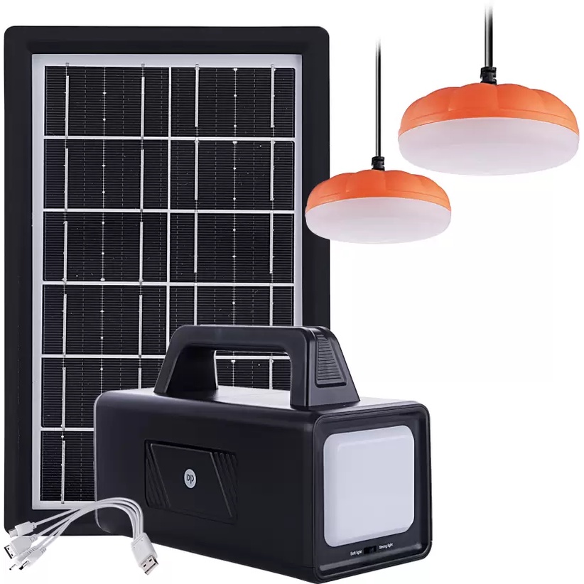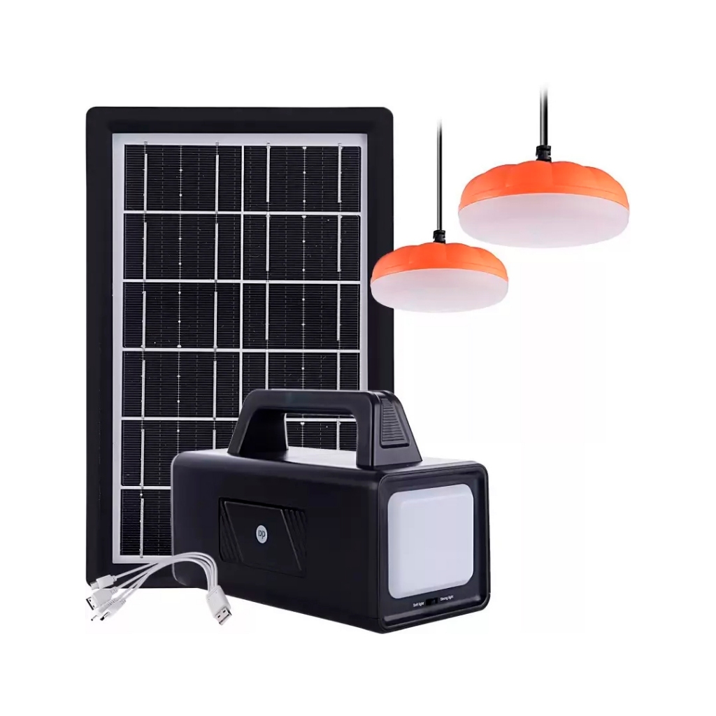 Kit Bateria Portátil Painel Solar 2 Lâmpadas Led 2usb Cor Preto DP-7709 80W