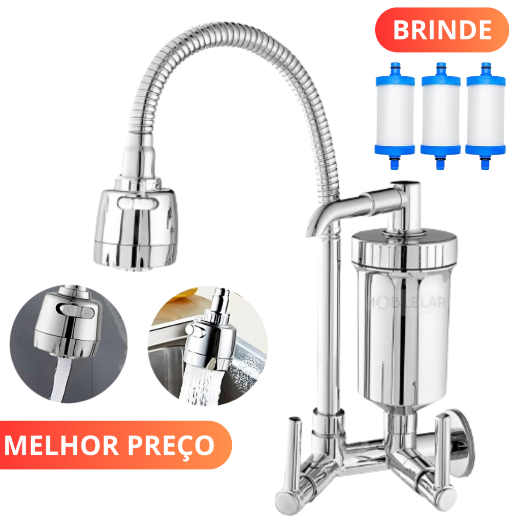 Torneira Gourmet Com Filtro Cozinha Parede Pia 1/4 De Volta + 3 Refil Extra