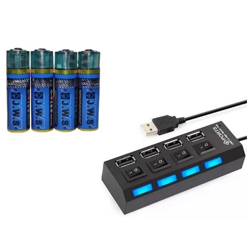 4 Pilhas AA Recarregável USB 1.5v 1.500mAh JWS Pequena + Carregador Hub Usb 2.0 Com 4 Portas