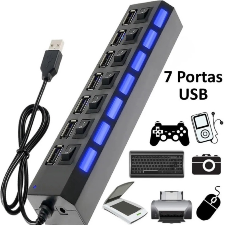 Hub Usb 7 Portas Carregador Adaptador Led Chave Seletora 2.0