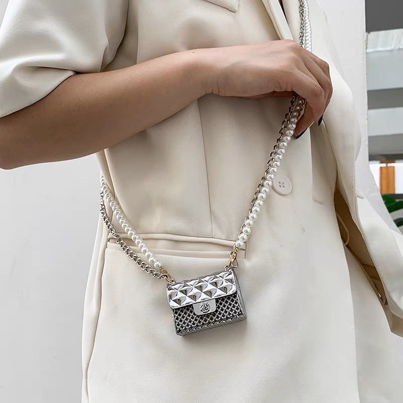Kit 2 peças/INS Estilo mini Bolsa De Metal Oco Saco Do Fone De Ouvido Pérola Dupla Camada Cinta Pequena Moda Cadeia De Cintura Com Tudo Acessórios