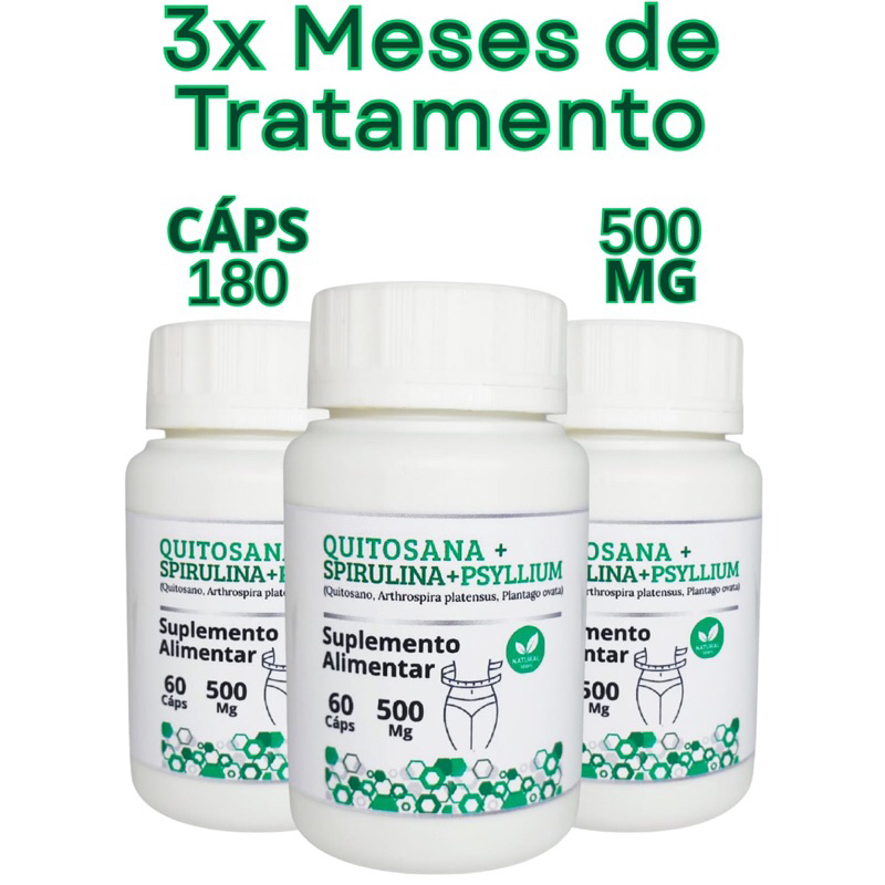 3x Frascos Quitosana + Spirulina + Psyllium Suplemento Natural | 180 Cápsulas 500 Mg
