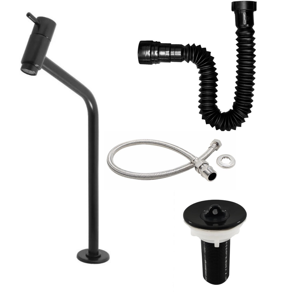 Kit Torneira Lavatorio Banheiro Preto / Black Metal Valvula Preta + Sifão Preto + Flexível