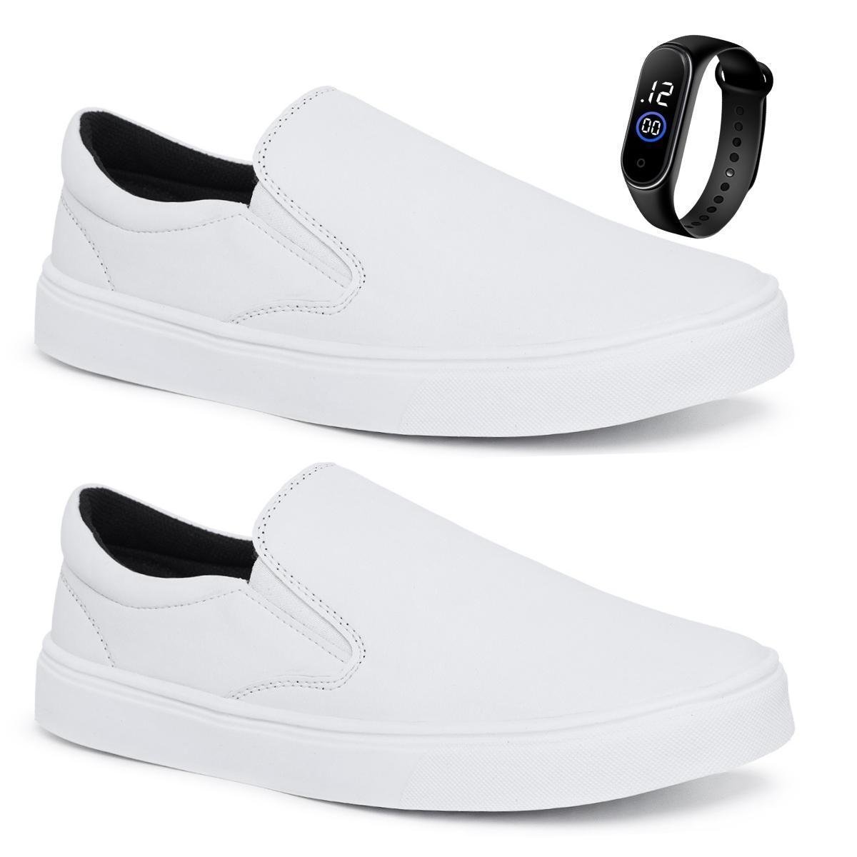 Kit 2 Pares Tênis Sapatênis Slip On Iate Branco Enfermagem Calce Fácil Casual Conforto + Relógio