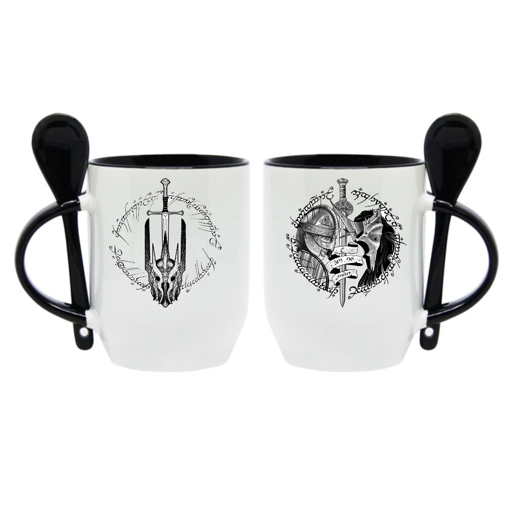 CANECA BRANCA E PRETA COM COLHER SENHOR DOS ANÉIS SAURON MOD 01
