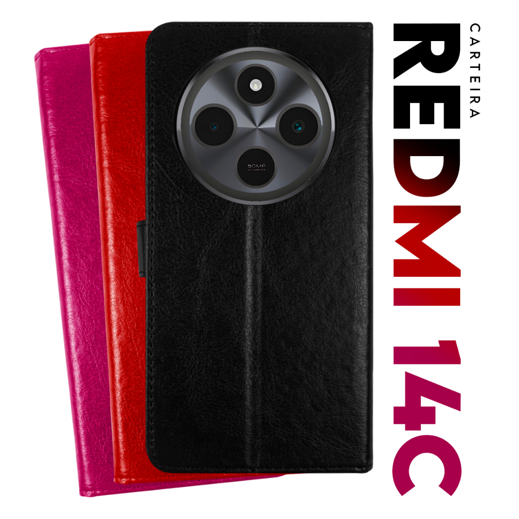 Capa Case Capinha Carteira Flip Cover Couro Sintético PRETA Para Novo Xiaomi Redmi 14c tela 6.88 pol. Cell in Power25