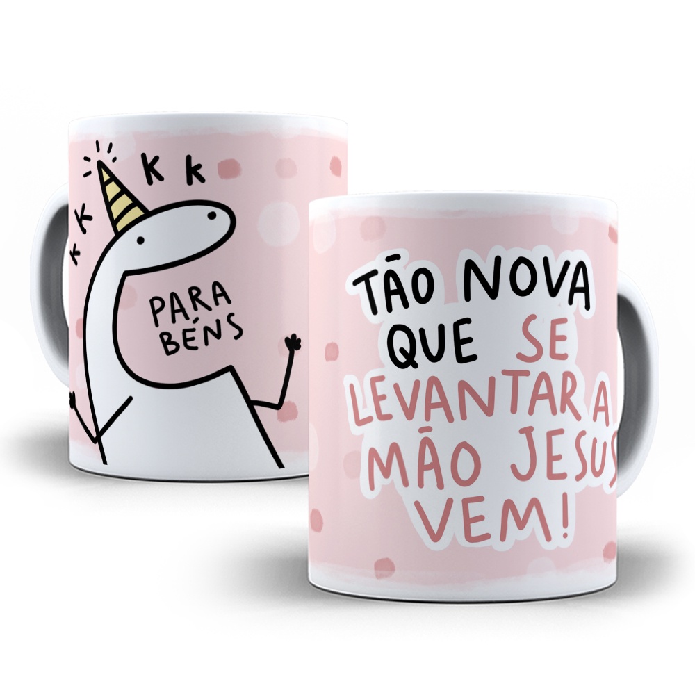 Caneca Personalizada de Porcelana - Parabéns Flork / Tão nova que se levantar a mão Jesus vem