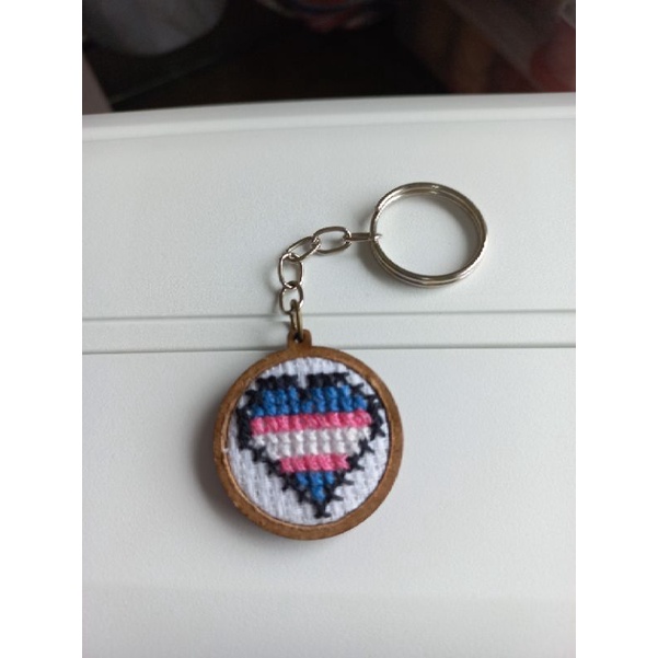 Chaveiro Mini bastidor bordado ponto cruz - Coração - Bandeira Transsexualidade - Orgulho LGBTQIA+. Pride